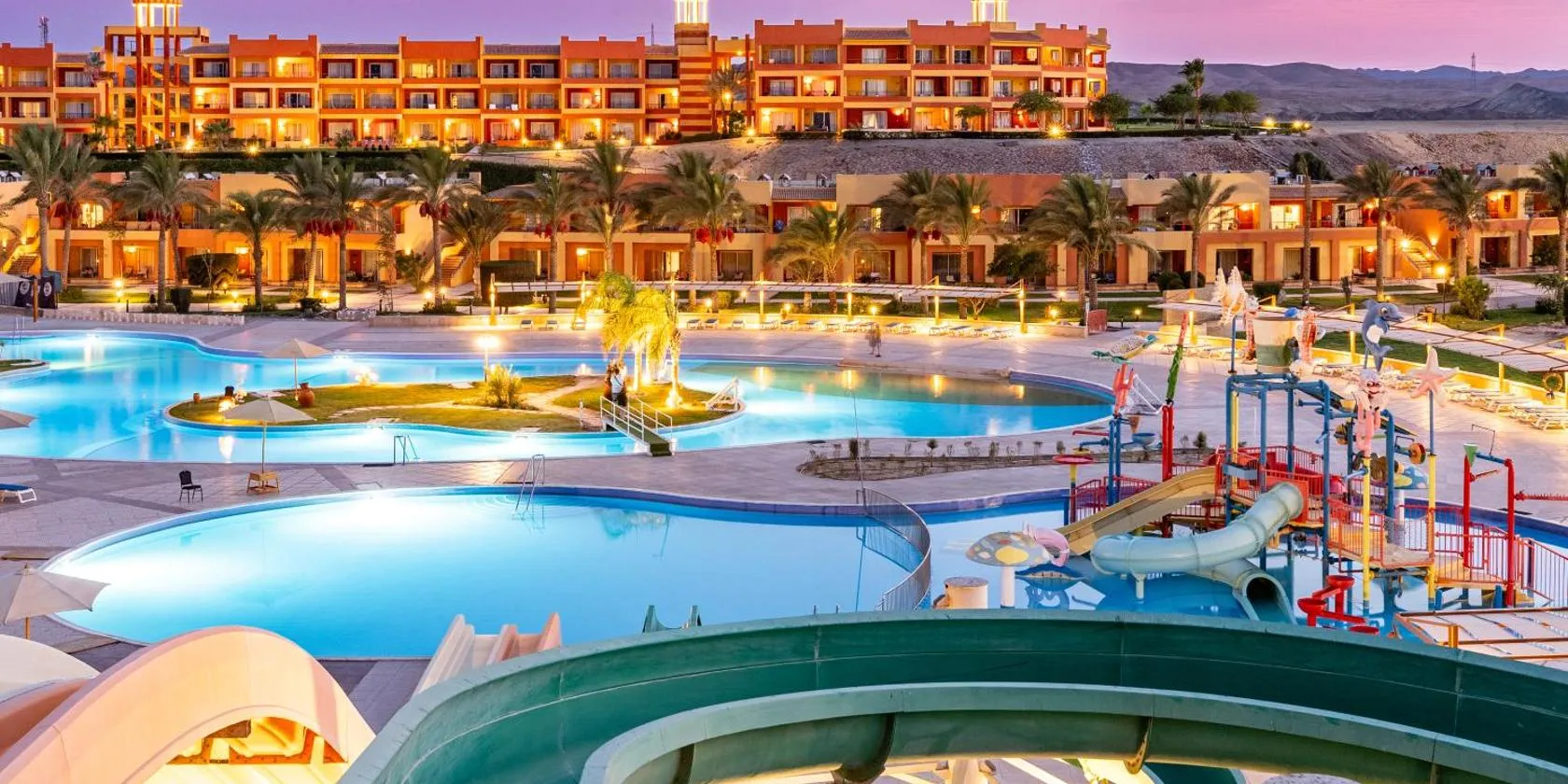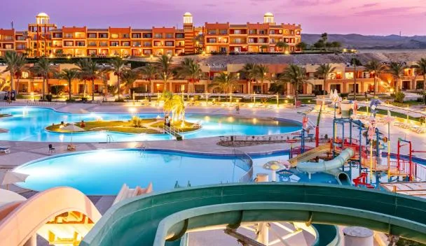 Located on the West Coast of Egypt’s Red Sea with a beachfront location, this resort looks like a small village surrounding 4 outdoor pools.